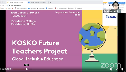 今回のバーチャルプロジェクト展は、JEARNから、セッション01で啓明学園中学高等学校による”Girl Rising "、セッション02では、 明治学院大学 とアメリカ・ロード・アイランド州の Providence Collegeで学ぶ教員養成過程の学生 との 協働による"KOSKO Future Teachers”の2グループが作品と成果を発表しました 。