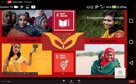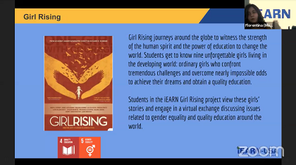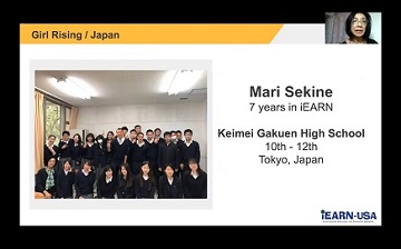 JEARNからは 、啓明学 園高等学校の関根真理先生が 、S DGs「 質の高い教育・ジェンダー平等の実現」に関連する Girl Rising プロジェクトの報告をiEARNを代表して行いました。以下の写真はそのオンラインプレゼンの様子です 。