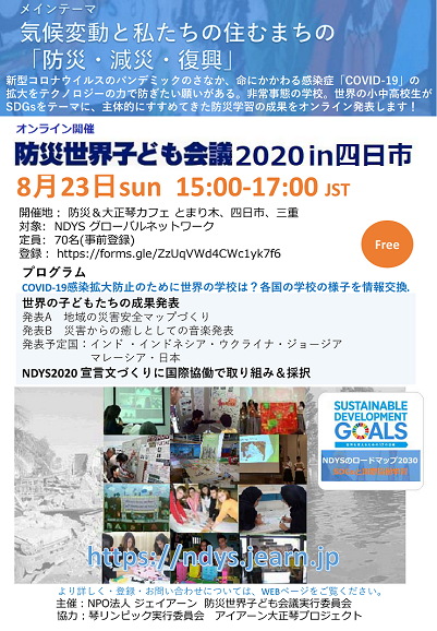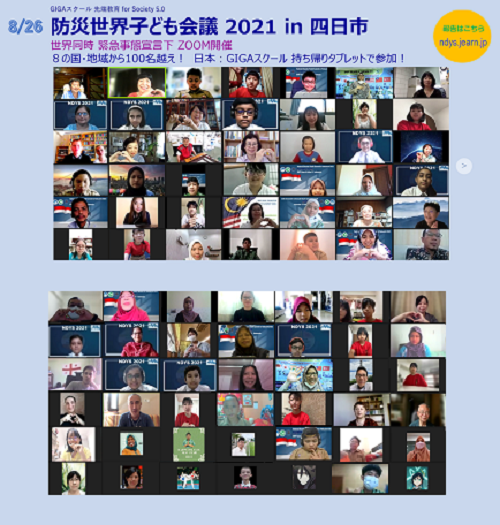 NDYS2021では3月から、ネットワークでつながった世界の子どもたちが、オンライン会議で仲間との交流を深めながら「ニューノーマル (多様性、市民性、環境危機意識、デジタル化) な視点から、自然災害と感染症との複合災害危機をどう生き抜くか」をテーマに、この難局を切り抜ける話し合いを重ねてきました。そのまとめとして、8月26日、 「 防災世界子ども会議2021 in 四日市 」オンライン開催でその成果を発表しました。