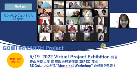 日本からは、青山学院大学国際政治経済学部(SIPEC)の学生3名 が、ジェイアーン Youth Projectとして、 Gomi on EARTHプロジェクトの一環として実施してきた ”Mottainai Workshop " について発表しました。台湾・インド・エジプトの学校と、プラスティックごみ問題について共に考える機会をもてたことや、その成果について紹介しました。