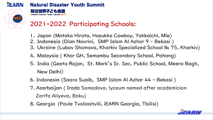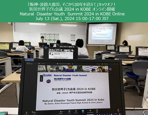 NDYS2024は、SDGsと防災教育~災害に強い持続可能な社会の創り手を育てる学び~をテーマに国際協働学習にとりくみ、そのまとめとして、 「防災世界子ども会議2024 in KOBE」を7月13日にオンライン開催しました。 世界8の国・地域の生徒が参加しました。