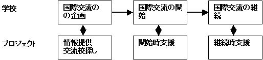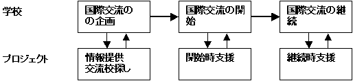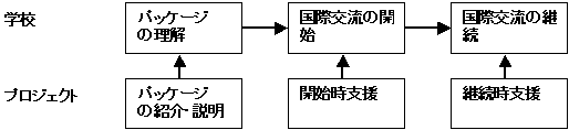 図1.1にパッケージを使用した国際交流を示す。この場合、プロジェクト側で学校側を支援しながら、パッケージをもとにした交際交流の授業を実践していく。 2) 本プロジェクトと共同した国際交流